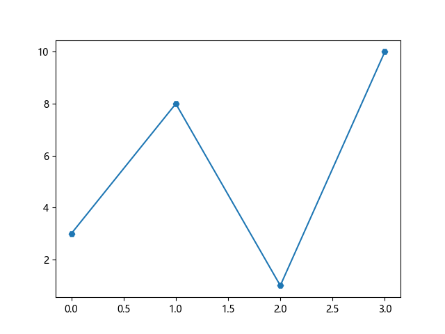 # 这三行代码使编译器能够绘图: import sys import matplotlib matplotlib.use('Agg') import matplotlib.pyplot as plt import numpy as np ypoints = np.array([3, 8, 1, 10]) # 使用大号六边形标记绘制 plt.plot(ypoints, marker = 'H') plt.show() # 这两行代码使编译器能够输出图形: plt.savefig(sys.stdout.buffer) sys.stdout.flush()