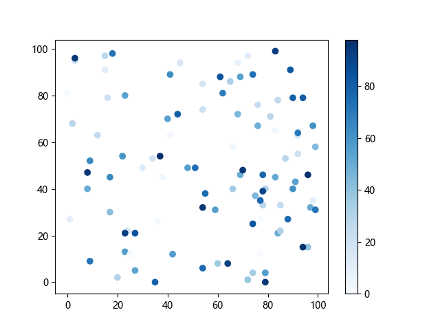 # 这三行代码使编译器能够绘图: import sys import matplotlib matplotlib.use('Agg') import matplotlib.pyplot as plt import numpy as np x = np.random.randint(100, size=(100)) y = np.random.randint(100, size=(100)) colors = np.random.randint(100, size=(100)) # 使用蓝色渐变绘制散点图: plt.scatter(x, y, c=colors, cmap='Blues') plt.colorbar() # 显示颜色条 plt.show() # 显示图形 # 这两行代码使编译器能够输出图形: plt.savefig(sys.stdout.buffer) sys.stdout.flush()
