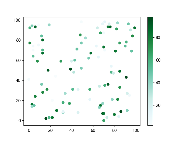 # 这三行代码使编译器能够绘图: import sys import matplotlib matplotlib.use('Agg') import matplotlib.pyplot as plt import numpy as np x = np.random.randint(100, size=(100)) y = np.random.randint(100, size=(100)) colors = np.random.randint(100, size=(100)) # 使用蓝绿色渐变绘制散点图: plt.scatter(x, y, c=colors, cmap='BuGn') plt.colorbar() # 显示颜色条 plt.show() # 显示图形 # 这两行代码使编译器能够输出图形: plt.savefig(sys.stdout.buffer) sys.stdout.flush()