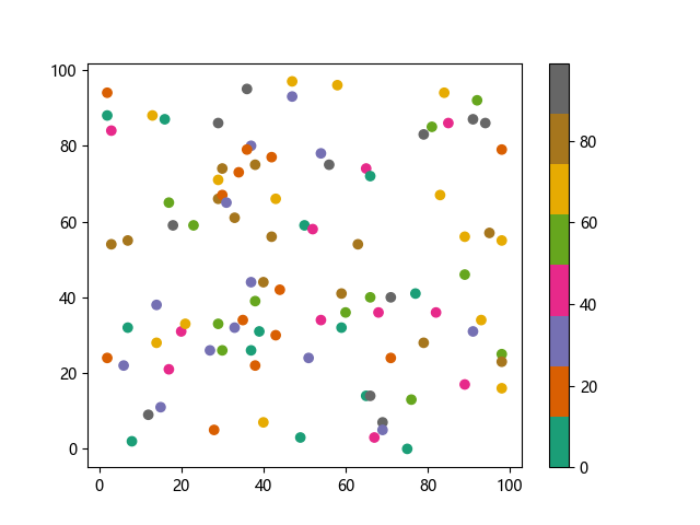 # 这三行代码使编译器能够绘图: import sys import matplotlib matplotlib.use('Agg') import matplotlib.pyplot as plt import numpy as np x = np.random.randint(100, size=(100)) y = np.random.randint(100, size=(100)) colors = np.random.randint(100, size=(100)) # 使用 Dark2 配色方案绘制散点图: plt.scatter(x, y, c=colors, cmap='Dark2') plt.colorbar() plt.show() # 这两行代码使编译器能够输出图形: plt.savefig(sys.stdout.buffer) sys.stdout.flush()