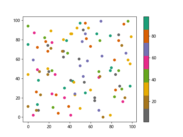 # 这三行代码使编译器能够绘图: import sys import matplotlib matplotlib.use('Agg') import matplotlib.pyplot as plt import numpy as np x = np.random.randint(100, size=(100)) y = np.random.randint(100, size=(100)) colors = np.random.randint(100, size=(100)) # 使用反向 Dark2 配色方案绘制散点图: plt.scatter(x, y, c=colors, cmap='Dark2_r') plt.colorbar() plt.show() # 这两行代码使编译器能够输出图形: plt.savefig(sys.stdout.buffer) sys.stdout.flush()