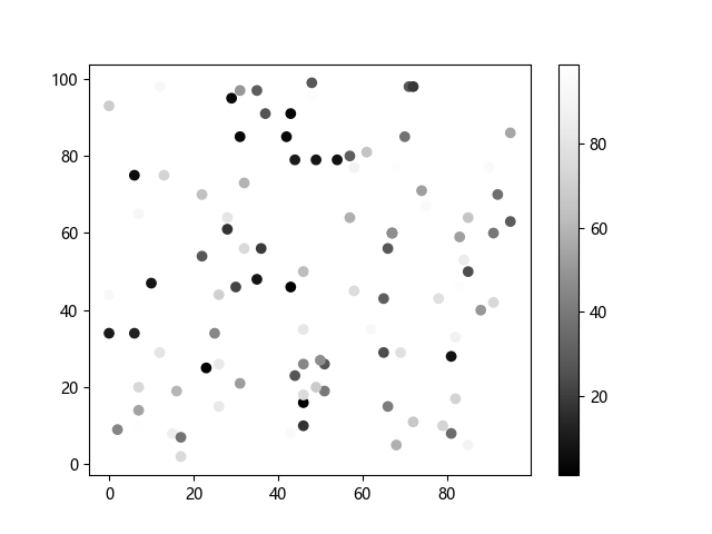 # 这三行代码使编译器能够绘图: import sys import matplotlib matplotlib.use('Agg') import matplotlib.pyplot as plt import numpy as np x = np.random.randint(100, size=(100)) y = np.random.randint(100, size=(100)) colors = np.random.randint(100, size=(100)) # 使用反向灰度渐变绘制散点图: plt.scatter(x, y, c=colors, cmap='Greys_r') plt.colorbar() plt.show() # 这两行代码使编译器能够输出图形: plt.savefig(sys.stdout.buffer) sys.stdout.flush()