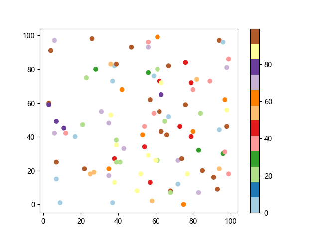 # 这三行代码使编译器能够绘图: import sys import matplotlib matplotlib.use('Agg') import matplotlib.pyplot as plt import numpy as np x = np.random.randint(100, size=(100)) y = np.random.randint(100, size=(100)) colors = np.random.randint(100, size=(100)) # 使用配对色系绘制散点图: plt.scatter(x, y, c=colors, cmap='Paired') plt.colorbar() plt.show() # 这两行代码使编译器能够输出图形: plt.savefig(sys.stdout.buffer) sys.stdout.flush()