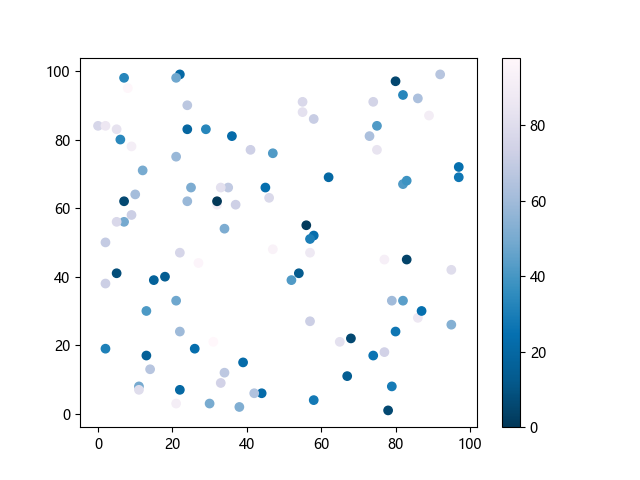 # 这三行代码使编译器能够绘图: import sys import matplotlib matplotlib.use('Agg') import matplotlib.pyplot as plt import numpy as np # 生成随机数据: x = np.random.randint(100, size=(100)) y = np.random.randint(100, size=(100)) colors = np.random.randint(100, size=(100)) # 使用 PuBu_r 配色方案绘制紫蓝色反向渐变色散点图: plt.scatter(x, y, c=colors, cmap='PuBu_r') plt.colorbar() # 显示颜色条 plt.show() # 显示图形 # 这两行代码使编译器能够输出图形: plt.savefig(sys.stdout.buffer) sys.stdout.flush()