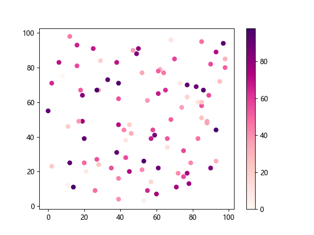 # 这三行代码使编译器能够绘图: import sys import matplotlib matplotlib.use('Agg') import matplotlib.pyplot as plt import numpy as np # 生成随机数据 x = np.random.randint(100, size=(100)) y = np.random.randint(100, size=(100)) colors = np.random.randint(100, size=(100)) # 使用 RdPu 配色方案绘制红紫色渐变色散点图: plt.scatter(x, y, c=colors, cmap='RdPu') plt.colorbar() # 显示颜色条 plt.show() # 显示图形 # 这两行代码使编译器能够输出图形: plt.savefig(sys.stdout.buffer) sys.stdout.flush()