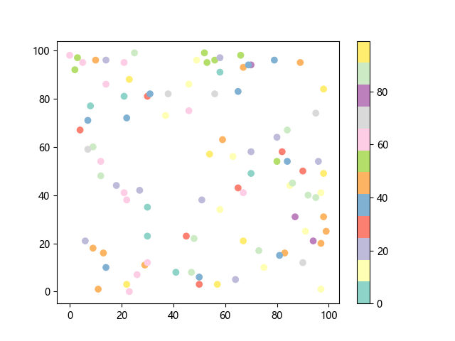 # 这三行代码使编译器能够绘图: import sys import matplotlib matplotlib.use('Agg') import matplotlib.pyplot as plt import numpy as np # 生成随机数据: x = np.random.randint(100, size=(100)) y = np.random.randint(100, size=(100)) colors = np.random.randint(100, size=(100)) # 使用 Set3 (12 色调色板)配色方案绘制 Set3 离散色散点图: plt.scatter(x, y, c=colors, cmap='Set3') plt.colorbar() # 显示颜色条 plt.show() # 显示图形 # 这两行代码使编译器能够输出图形: plt.savefig(sys.stdout.buffer) sys.stdout.flush()