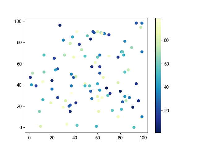 # 这三行代码使编译器能够绘图: import sys import matplotlib matplotlib.use('Agg') import matplotlib.pyplot as plt import numpy as np # 生成随机数据点: x = np.random.randint(100, size=(100)) y = np.random.randint(100, size=(100)) colors = np.random.randint(100, size=(100)) # 使用 YlGnBu_r (黄-绿-蓝反向渐变)配色方案绘制散点图: plt.scatter(x, y, c=colors, cmap='YlGnBu_r') plt.colorbar() # 显示颜色条 plt.show() # 显示图形 # 这两行代码使编译器能够输出图形: plt.savefig(sys.stdout.buffer) sys.stdout.flush()