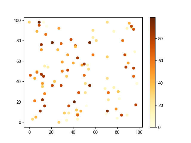 # 这三行代码使编译器能够绘图: import sys import matplotlib matplotlib.use('Agg') import matplotlib.pyplot as plt import numpy as np # 生成随机数据: x = np.random.randint(100, size=(100)) y = np.random.randint(100, size=(100)) colors = np.random.randint(100, size=(100)) # 使用 YlOrBr (黄-橙-棕渐变)配色方案绘制黄橙棕渐变散点图: plt.scatter(x, y, c=colors, cmap='YlOrBr') plt.colorbar() # 显示颜色条 plt.show() # 显示图形 # 这两行代码使编译器能够输出图形: plt.savefig(sys.stdout.buffer) sys.stdout.flush()