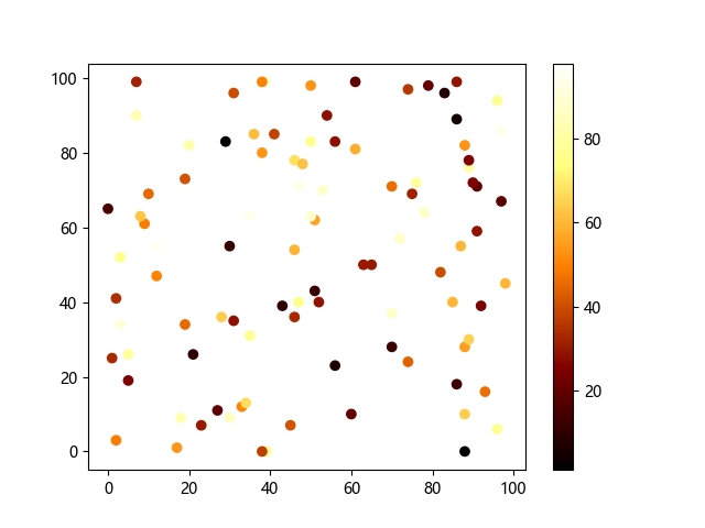 # 这三行代码使编译器能够绘图: import sys import matplotlib matplotlib.use('Agg') import matplotlib.pyplot as plt import numpy as np # 生成随机数据: x = np.random.randint(100, size=(100)) y = np.random.randint(100, size=(100)) colors = np.random.randint(100, size=(100)) # 使用 afmhot (热金属)配色方案绘制热金属色散点图: plt.scatter(x, y, c=colors, cmap='afmhot') plt.colorbar() # 显示颜色条 plt.show() # 显示图形 # 这两行代码使编译器能够输出图形: plt.savefig(sys.stdout.buffer) sys.stdout.flush()
