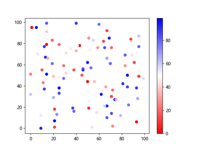 # 这三行代码使编译器能够绘图: import sys import matplotlib matplotlib.use('Agg') import matplotlib.pyplot as plt import numpy as np # 生成随机数据点 x = np.random.randint(100, size=(100)) y = np.random.randint(100, size=(100)) colors = np.random.randint(100, size=(100)) # 使用 bwr_r 配色方案绘制蓝白红反向渐变色散点图: plt.scatter(x, y, c=colors, cmap='bwr_r') plt.colorbar() plt.show() # 这两行代码使编译器能够输出图形: plt.savefig(sys.stdout.buffer) sys.stdout.flush()