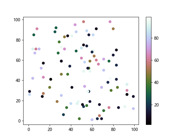 # 这三行代码使编译器能够绘图: import sys import matplotlib matplotlib.use('Agg') import matplotlib.pyplot as plt import numpy as np # 生成随机数据 x = np.random.randint(100, size=(100)) y = np.random.randint(100, size=(100)) colors = np.random.randint(100, size=(100)) # 使用 cubehelix 配色方案绘制螺旋立方体渐变色散点图: plt.scatter(x, y, c=colors, cmap='cubehelix') plt.colorbar() plt.show() # 这两行代码使编译器能够输出图形: plt.savefig(sys.stdout.buffer) sys.stdout.flush()