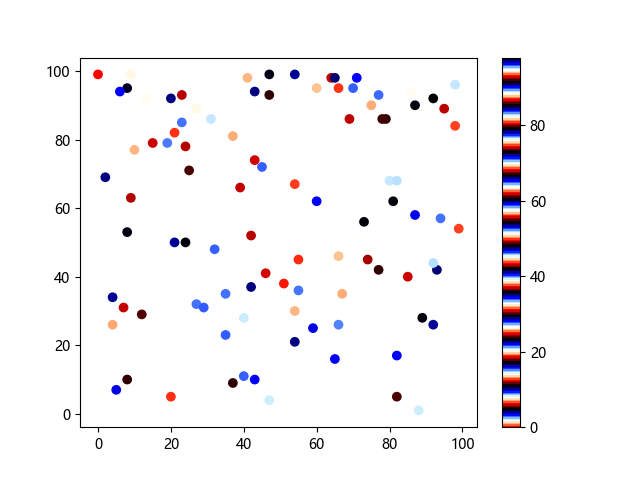 # 这三行代码使编译器能够绘图: import sys import matplotlib matplotlib.use('Agg') import matplotlib.pyplot as plt import numpy as np # 生成随机数据 x = np.random.randint(100, size=(100)) y = np.random.randint(100, size=(100)) colors = np.random.randint(100, size=(100)) # 使用 flag 配色方案绘制旗帜渐变色散点图: plt.scatter(x, y, c=colors, cmap='flag') plt.colorbar() plt.show() # 这两行代码使编译器能够输出图形: plt.savefig(sys.stdout.buffer) sys.stdout.flush()
