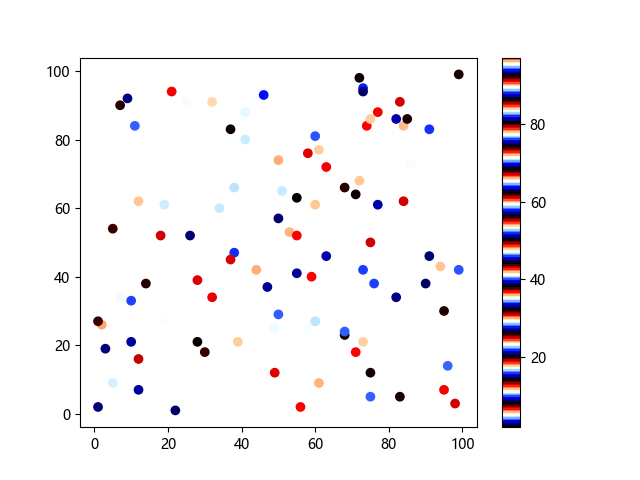 # 这三行代码使编译器能够绘图: import sys import matplotlib matplotlib.use('Agg') import matplotlib.pyplot as plt import numpy as np # 生成随机数据点 x = np.random.randint(100, size=(100)) y = np.random.randint(100, size=(100)) colors = np.random.randint(100, size=(100)) # 使用 flag_r 配色方案绘制旗帜反向渐变色散点图: plt.scatter(x, y, c=colors, cmap='flag_r') plt.colorbar() plt.show() # 这两行代码使编译器能够输出图形: plt.savefig(sys.stdout.buffer) sys.stdout.flush()