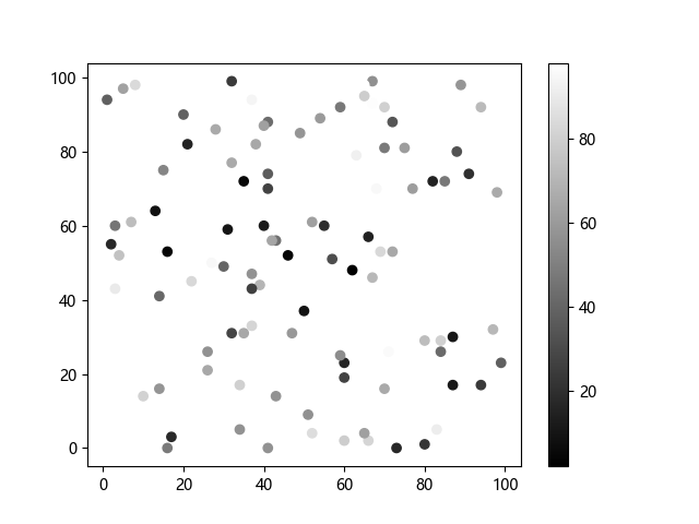# 这三行代码使编译器能够绘图: import sys import matplotlib matplotlib.use('Agg') import matplotlib.pyplot as plt import numpy as np # 生成随机数据 x = np.random.randint(100, size=(100)) y = np.random.randint(100, size=(100)) colors = np.random.randint(100, size=(100)) # 使用 gist_gray 配色方案绘制灰度渐变色散点图: plt.scatter(x, y, c=colors, cmap='gist_gray') plt.colorbar() plt.show() # 这两行代码使编译器能够输出图形: plt.savefig(sys.stdout.buffer) sys.stdout.flush()
