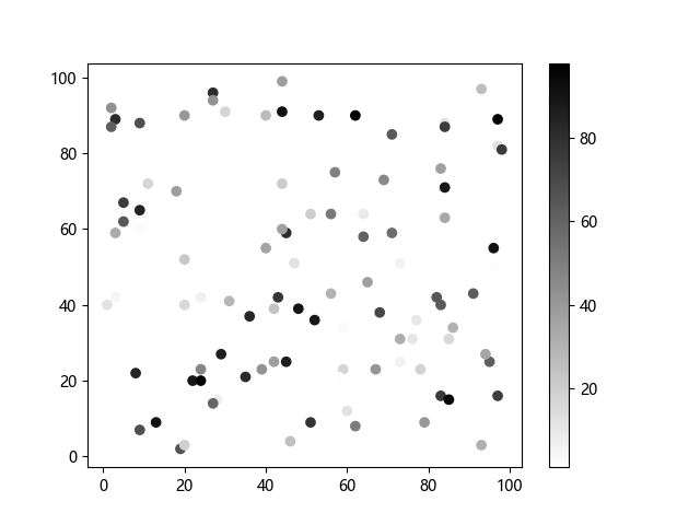 # 这三行代码使编译器能够绘图: import sys import matplotlib matplotlib.use('Agg') import matplotlib.pyplot as plt import numpy as np # 生成随机数据点 x = np.random.randint(100, size=(100)) y = np.random.randint(100, size=(100)) colors = np.random.randint(100, size=(100)) # 使用 gist_gray_r 配色方案绘制灰度反向渐变色散点图: plt.scatter(x, y, c=colors, cmap='gist_gray_r') plt.colorbar() plt.show() # 这两行代码使编译器能够输出图形: plt.savefig(sys.stdout.buffer) sys.stdout.flush()