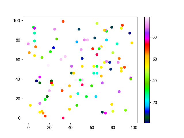 # 这三行代码使编译器能够绘图: import sys import matplotlib matplotlib.use('Agg') import matplotlib.pyplot as plt import numpy as np # 生成随机数据 x = np.random.randint(100, size=(100)) y = np.random.randint(100, size=(100)) colors = np.random.randint(100, size=(100)) # 使用 gist_ncar 配色方案绘制NCAR渐变色散点图: plt.scatter(x, y, c=colors, cmap='gist_ncar') plt.colorbar() plt.show() # 这两行代码使编译器能够输出图形: plt.savefig(sys.stdout.buffer) sys.stdout.flush()
