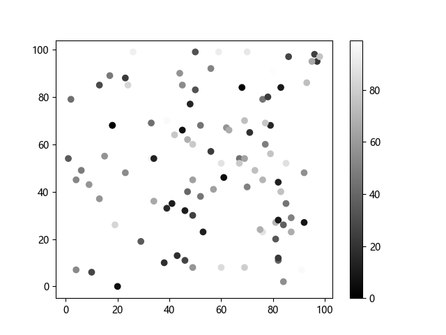 # 这三行代码使编译器能够绘图: import sys import matplotlib matplotlib.use('Agg') import matplotlib.pyplot as plt import numpy as np # 生成随机数据点 x = np.random.randint(100, size=(100)) y = np.random.randint(100, size=(100)) colors = np.random.randint(100, size=(100)) # 使用 gist_yarg_r 配色方案绘制灰度反向渐变色散点图: plt.scatter(x, y, c=colors, cmap='gist_yarg_r') plt.colorbar() plt.show() # 这两行代码使编译器能够输出图形: plt.savefig(sys.stdout.buffer) sys.stdout.flush()