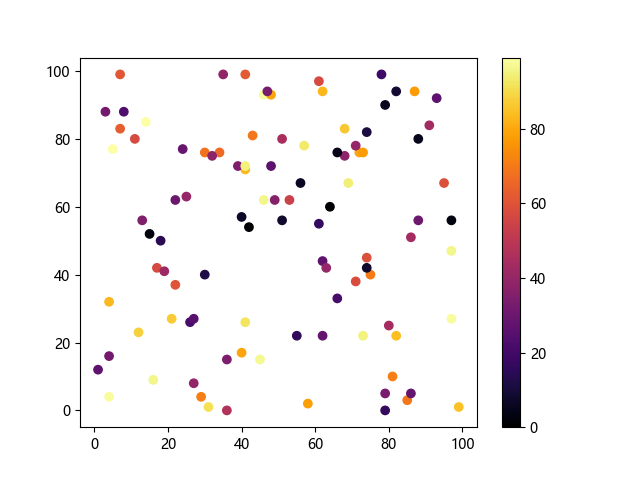 # 这三行代码使编译器能够绘图: import sys import matplotlib matplotlib.use('Agg') import matplotlib.pyplot as plt import numpy as np # 生成随机数据 x = np.random.randint(100, size=(100)) y = np.random.randint(100, size=(100)) colors = np.random.randint(100, size=(100)) # 使用 inferno 配色方案绘制地狱火渐变色散点图: plt.scatter(x, y, c=colors, cmap='inferno') plt.colorbar() plt.show() # 这两行代码使编译器能够输出图形: plt.savefig(sys.stdout.buffer) sys.stdout.flush()