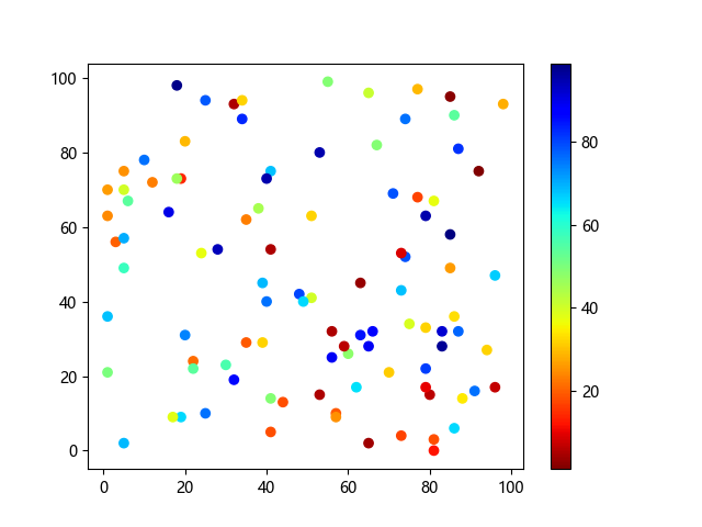 # 这三行代码使编译器能够绘图: import sys import matplotlib matplotlib.use('Agg') import matplotlib.pyplot as plt import numpy as np # 生成随机数据点 x = np.random.randint(100, size=(100)) y = np.random.randint(100, size=(100)) colors = np.random.randint(100, size=(100)) # 使用 jet_r 配色方案绘制 Jet 反向渐变色散点图: plt.scatter(x, y, c=colors, cmap='jet_r') plt.colorbar() plt.show() # 这两行代码使编译器能够输出图形: plt.savefig(sys.stdout.buffer) sys.stdout.flush()