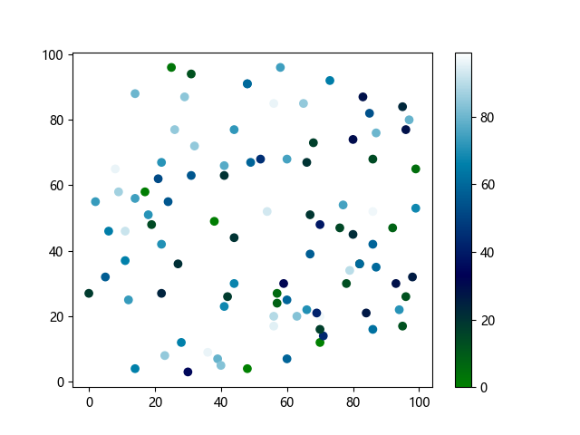 # 这三行代码使编译器能够绘图: import sys import matplotlib matplotlib.use('Agg') import matplotlib.pyplot as plt import numpy as np # 生成随机数据 x = np.random.randint(100, size=(100)) y = np.random.randint(100, size=(100)) colors = np.random.randint(100, size=(100)) # 使用 ocean 配色方案绘制海洋渐变色散点图: plt.scatter(x, y, c=colors, cmap='ocean') plt.colorbar() plt.show() # 这两行代码使编译器能够输出图形: plt.savefig(sys.stdout.buffer) sys.stdout.flush()