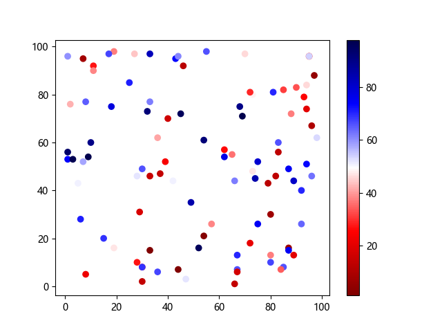 # 以下三行代码使编译器支持绘图功能: import sys import matplotlib matplotlib.use('Agg') import matplotlib.pyplot as plt import numpy as np # 生成随机数据: x = np.random.randint(100, size=(100)) y = np.random.randint(100, size=(100)) colors = np.random.randint(100, size=(100)) # 使用 seismic 反向配色方案创建散点图: plt.scatter(x, y, c=colors, cmap='seismic_r') plt.colorbar() plt.show() # 以下两行代码使编译器能够输出图形: plt.savefig(sys.stdout.buffer) sys.stdout.flush()