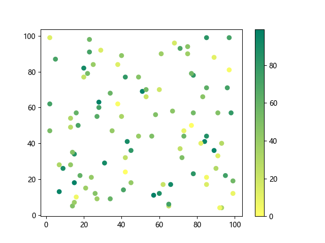 # 以下三行代码使编译器支持绘图功能: import sys import matplotlib matplotlib.use('Agg') import matplotlib.pyplot as plt import numpy as np # 生成随机数据: x = np.random.randint(100, size=(100)) y = np.random.randint(100, size=(100)) colors = np.random.randint(100, size=(100)) # 使用 summer 反向配色方案创建散点图: plt.scatter(x, y, c=colors, cmap='summer_r') plt.colorbar() plt.show() # 以下两行代码使编译器能够输出图形: plt.savefig(sys.stdout.buffer) sys.stdout.flush()