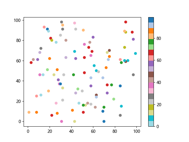 # 以下三行代码使编译器支持绘图功能: import sys import matplotlib matplotlib.use('Agg') import matplotlib.pyplot as plt import numpy as np # 生成随机数据: x = np.random.randint(100, size=(100)) y = np.random.randint(100, size=(100)) colors = np.random.randint(100, size=(100)) # 使用 tab20 反向离散配色方案创建散点图: plt.scatter(x, y, c=colors, cmap='tab20_r') plt.colorbar() plt.show() # 以下两行代码使编译器能够输出图形: plt.savefig(sys.stdout.buffer) sys.stdout.flush()
