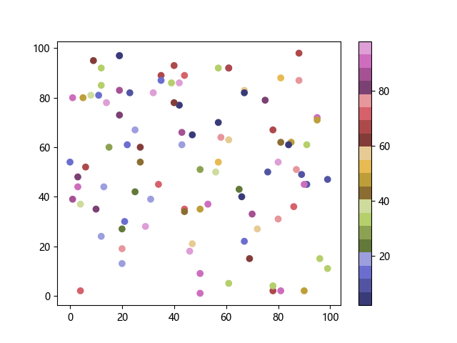 # 以下三行代码使编译器支持绘图功能: import sys import matplotlib matplotlib.use('Agg') import matplotlib.pyplot as plt import numpy as np # 生成随机数据: x = np.random.randint(100, size=(100)) y = np.random.randint(100, size=(100)) colors = np.random.randint(100, size=(100)) # 使用 tab20b 离散配色方案创建散点图: plt.scatter(x, y, c=colors, cmap='tab20b') plt.colorbar() plt.show() # 以下两行代码使编译器能够输出图形: plt.savefig(sys.stdout.buffer) sys.stdout.flush()