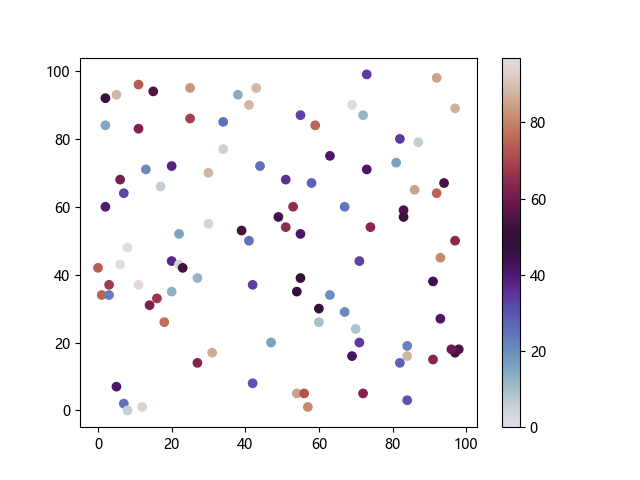 # 以下三行代码使编译器支持绘图功能: import sys import matplotlib matplotlib.use('Agg') import matplotlib.pyplot as plt import numpy as np # 生成随机数据: x = np.random.randint(100, size=(100)) y = np.random.randint(100, size=(100)) colors = np.random.randint(100, size=(100)) # 使用 twilight 配色方案创建散点图: plt.scatter(x, y, c=colors, cmap='twilight') plt.colorbar() plt.show() # 以下两行代码使编译器能够输出图形: plt.savefig(sys.stdout.buffer) sys.stdout.flush()