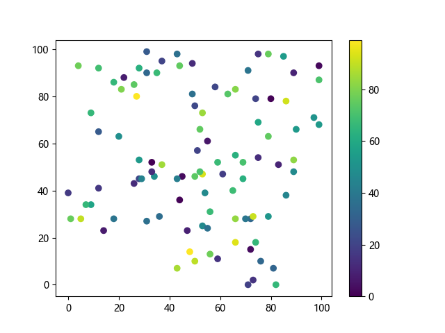 # 以下三行代码使编译器支持绘图功能: import sys import matplotlib matplotlib.use('Agg') import matplotlib.pyplot as plt import numpy as np # 生成随机数据: x = np.random.randint(100, size=(100)) y = np.random.randint(100, size=(100)) colors = np.random.randint(100, size=(100)) # 使用 viridis 配色方案创建散点图: plt.scatter(x, y, c=colors, cmap='viridis') plt.colorbar() plt.show() # 以下两行代码使编译器能够输出图形: plt.savefig(sys.stdout.buffer) sys.stdout.flush()