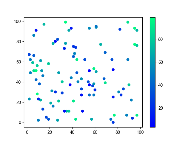# 以下三行代码使编译器支持绘图功能: import sys import matplotlib matplotlib.use('Agg') import matplotlib.pyplot as plt import numpy as np # 生成随机数据: x = np.random.randint(100, size=(100)) y = np.random.randint(100, size=(100)) colors = np.random.randint(100, size=(100)) # 使用冬季 (winter) 配色方案创建散点图: plt.scatter(x, y, c=colors, cmap='winter') plt.colorbar() plt.show() # 以下两行代码使编译器能够输出图形: plt.savefig(sys.stdout.buffer) sys.stdout.flush()