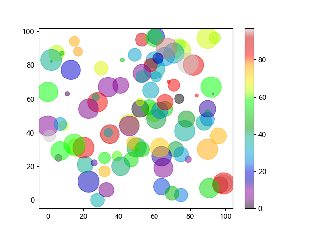 # 以下三行代码使编译器支持绘图功能: import sys import matplotlib matplotlib.use('Agg') import matplotlib.pyplot as plt import numpy as np # 生成随机数据: x = np.random.randint(100, size=(100)) y = np.random.randint(100, size=(100)) colors = np.random.randint(100, size=(100)) sizes = 10 * np.random.randint(100, size=(100)) # 点大小(10-990随机值) # 使用光谱配色、半透明效果创建散点图: plt.scatter(x, y, c=colors, s=sizes, alpha=0.5, cmap='nipy_spectral') plt.colorbar() plt.show() # 以下两行代码使编译器能够输出图形: plt.savefig(sys.stdout.buffer) sys.stdout.flush()