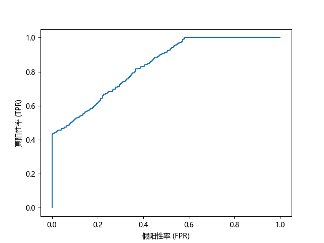 # 这三行代码使编译器能够绘图: import sys import matplotlib matplotlib.use('Agg') import numpy as np import matplotlib.pyplot as plt from sklearn.metrics import accuracy_score, confusion_matrix, roc_auc_score, roc_curve n = 10000 ratio = .95 n_0 = int((1-ratio) * n) # 少数类样本数 n_1 = int(ratio * n) # 多数类样本数 y = np.array([0] * n_0 + [1] * n_1) # 真实标签 # 从假设模型中获取的概率值(不总是预测众数类): y_proba_2 = np.array( np.random.uniform(0, .7, n_0).tolist() + # 类别 0 的预测概率 np.random.uniform(.3, 1, n_1).tolist() # 类别 1 的预测概率 ) y_pred_2 = y_proba_2 > .5 # 以 0.5 为阈值生成预测标签 def plot_roc_curve(true_y, y_prob): """ 根据预测概率绘制 ROC 曲线 """ fpr, tpr, thresholds = roc_curve(true_y, y_prob) plt.plot(fpr, tpr) plt.xlabel('假阳性率 (FPR)') plt.ylabel('真阳性率 (TPR)') # 绘制 ROC 曲线并输出 AUC 分数: plot_roc_curve(y, y_proba_2) print(f'模型 2 AUC 分数: {roc_auc_score(y, y_proba_2)}') # 这两行代码使编译器能够输出图形: plt.savefig(sys.stdout.buffer) sys.stdout.flush()