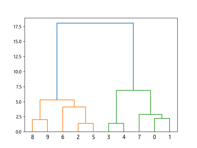 # 这三行代码使编译器支持绘图功能: import sys import matplotlib matplotlib.use('Agg') import numpy as np import matplotlib.pyplot as plt from scipy.cluster.hierarchy import dendrogram, linkage # 定义样本数据点坐标: x = [4, 5, 10, 4, 3, 11, 14, 6, 10, 12] y = [21, 19, 24, 17, 16, 25, 24, 22, 21, 21] # 组合数据点: data = list(zip(x, y)) # 计算层次聚类链接矩阵(使用 ward 方法和欧式距离): linkage_data = linkage( data, method='ward', # 聚类合并方法 metric='euclidean' # 距离度量标准 ) # 绘制树状图: dendrogram(linkage_data) # 显示图形: plt.show() # 这两行代码使编译器能够输出图形: plt.savefig(sys.stdout.buffer) sys.stdout.flush()