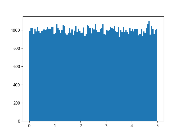 # 使编译器支持绘图的三行配置: import sys import matplotlib matplotlib.use('Agg') import numpy import matplotlib.pyplot as plt x = numpy.random.uniform(0.0, 5.0, 100000) plt.hist(x, 100) plt.show() # 实现编译器绘图功能的两行代码: plt.savefig(sys.stdout.buffer) sys.stdout.flush()
