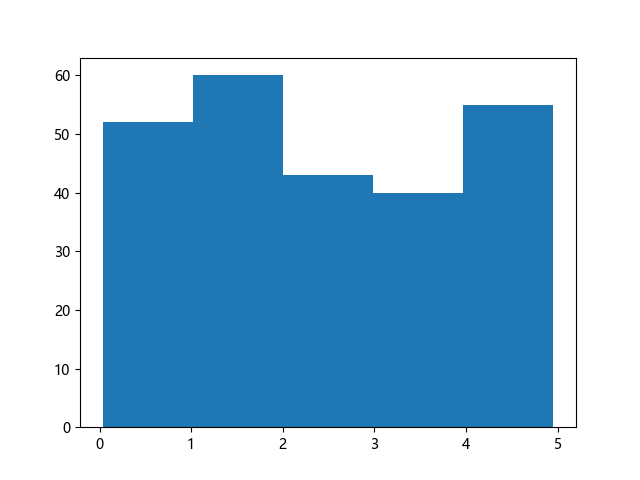 # 使我们的编译器能够绘制的三行代码: import sys import matplotlib matplotlib.use('Agg') import numpy import matplotlib.pyplot as plt x = numpy.random.uniform(0.0, 5.0, 250) plt.hist(x, 5) plt.show() # 使我们的编译器能够绘制的两行代码: plt.savefig(sys.stdout.buffer) sys.stdout.flush()