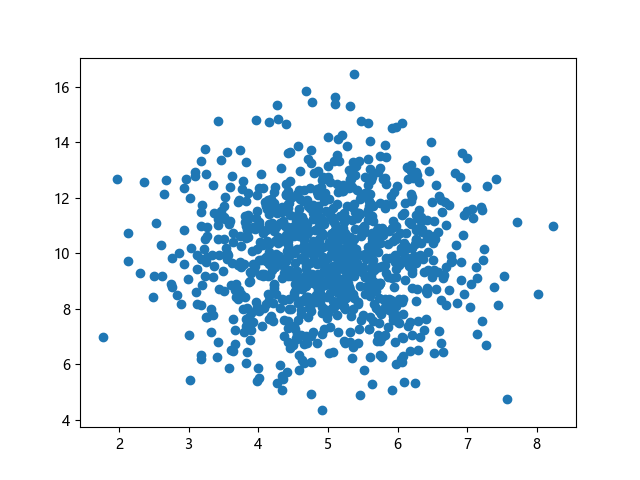 # 三行配置使编译器支持绘图功能: import sys import matplotlib matplotlib.use('Agg') import numpy import matplotlib.pyplot as plt # 生成正态分布数据:x~N(5.0,1.0),y~N(10.0,2.0),各 1000 个样本点: x = numpy.random.normal(5.0, 1.0, 1000) y = numpy.random.normal(10.0, 2.0, 1000) # 绘制散点图 plt.scatter(x, y) plt.show() # 两行代码实现图形输出: plt.savefig(sys.stdout.buffer) sys.stdout.flush()