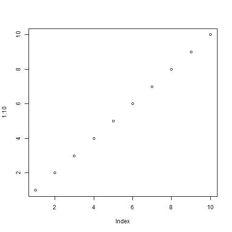 # 我们需要这行代码来在我们的编译器中显示图形 png(filename="output.png") # 在图中绘制从 1 到 10 的数字 plot(1:10)