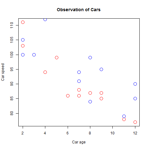 # 我们需要这行代码才能在编译器中显示图表 png(filename="output.png") # 第一天,12 辆汽车的车龄和速度: x1 <- c(5,7,8,7,2,2,9,4,11,12,9,6) y1 <- c(99,86,87,88,111,103,87,94,78,77,85,86) # 第二天,15 辆汽车的车龄和速度: x2 <- c(2,2,8,1,15,8,12,9,7,3,11,4,7,14,12) y2 <- c(100,105,84,105,90,99,90,95,94,100,79,112,91,80,85) # 绘制第一天的数据,红色点,点的大小为 2: plot(x1, y1, main="Observation of Cars", xlab="Car age", ylab="Car speed", col="red", cex=2) # 在同一图中添加第二天的数据,蓝色点,点的大小为 2: points(x2, y2, col="blue", cex=2)